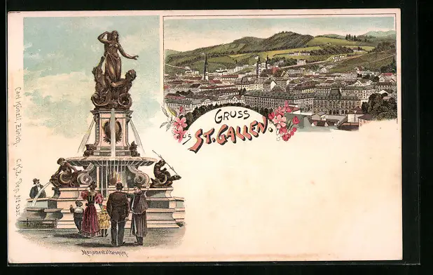 Lithographie St. Gallen, Teilansicht, Monumentalbrunnen