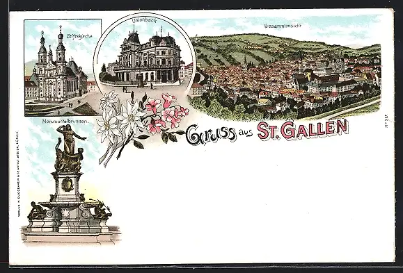 Lithographie St. Gallen, Unionbank, Stiftskirche und Monumentalbrunnen