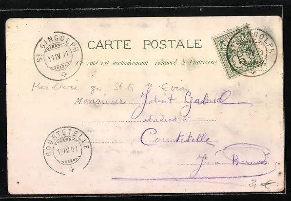 Personenbezogene Daten auf der Rückseite der Karte wurden durch blauen Textmarker unkenntlich gemacht. Die blauen Stellen sind auf die Vorderseite durchgeweicht und wirken sich negativ auf das Postkartenfoto aus
