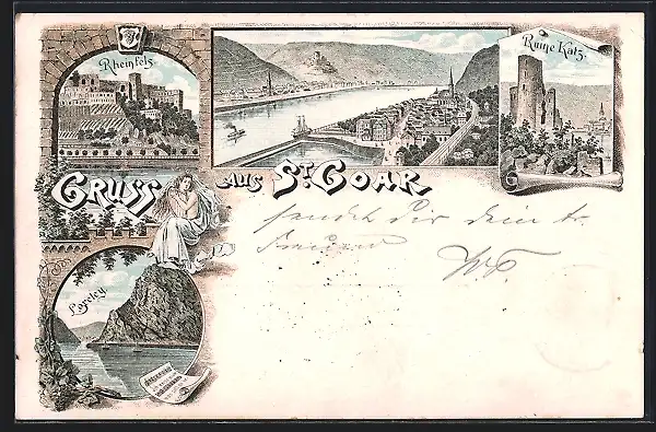 Lithographie St. Goar, Rheinfels, Loreley und Ruine Katz