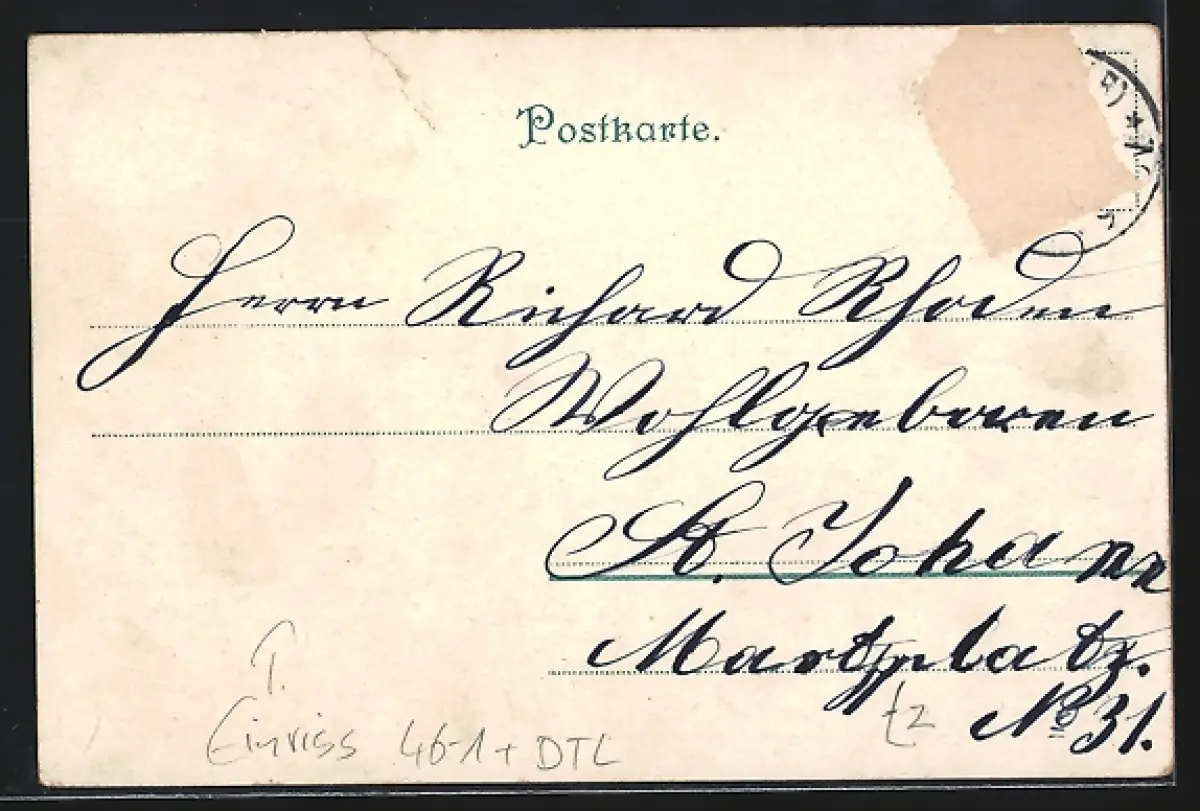 Personenbezogene Daten auf der Rückseite der Karte wurden durch blauen Textmarker unkenntlich gemacht. Die blauen Stellen sind auf die Vorderseite durchgeweicht und wirken sich negativ auf das Postkartenfoto aus