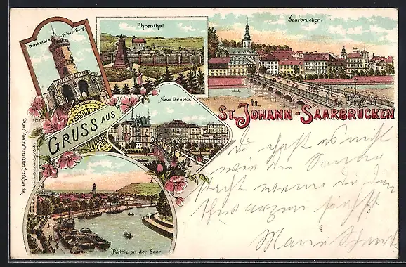 Lithographie St. Johann-Saarbrücken, Ehrenthal, Saarpartie, Neue Brücke, Teilansicht Saarbrücken