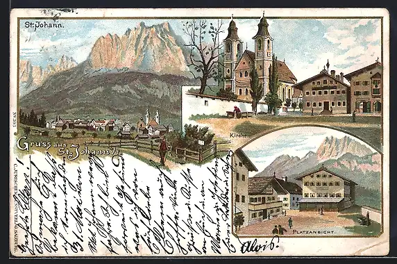 Lithographie St. Johann i / T., Ortsansicht, Kirche, Platzansicht