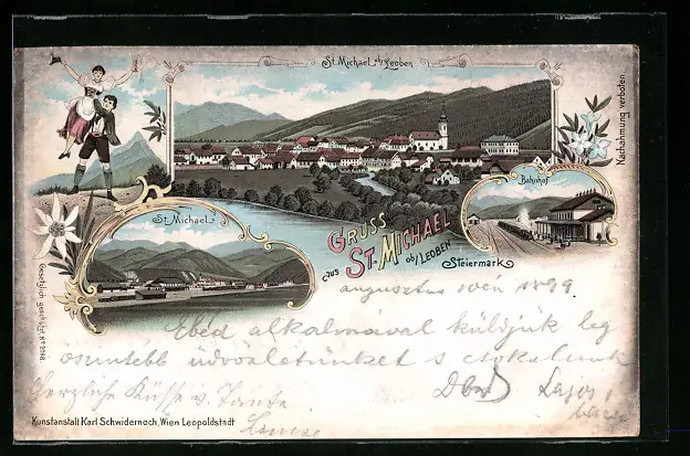 Lithographie St. Michael ob Leoben, Gesamtansicht mit Kirchturm und Bahnhof