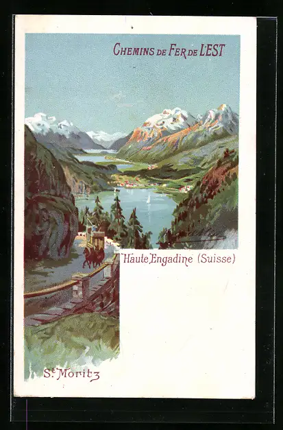 Lithographie St. Moritz, Panoramablick auf Ort und Seen