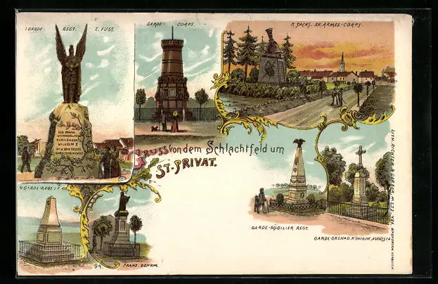 Lithographie St-Privat, Garde-Füsilier Regt., Franz-Denkmal, 1. Garde-Regt. zu Fuss
