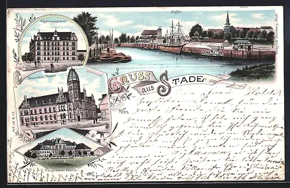 Lithographie Stade, Hafen, Kaiserliches Postamt und Königl. Lehrer-Seminar