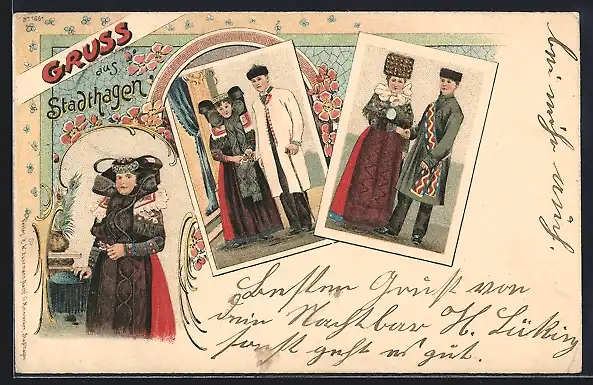 Lithographie Stadthagen, Pärchen und eine einzelne Frau in Tracht