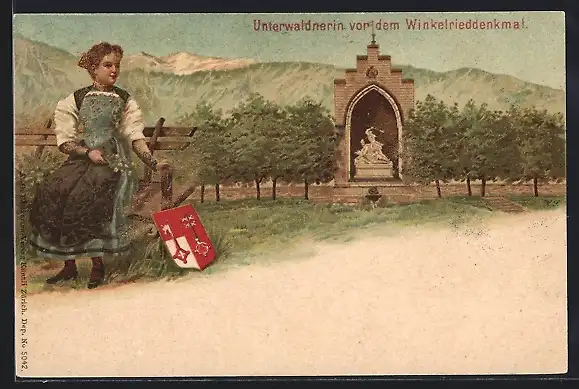 Lithographie Stans, Unterwaldnerin in Tracht vor dem Winkelrieddenkmal, Wappen