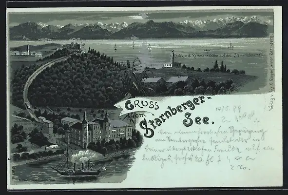 Lithographie Starnberg, Ortspanorama mit Bismarckdenkmal