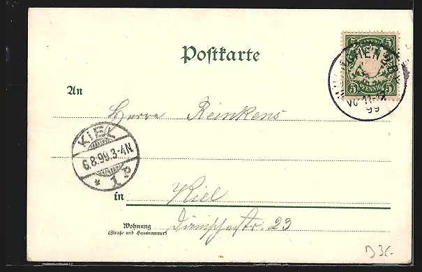 Personenbezogene Daten auf der Rückseite der Karte wurden durch blauen Textmarker unkenntlich gemacht. Die blauen Stellen sind auf die Vorderseite durchgeweicht und wirken sich negativ auf das Postkartenfoto aus