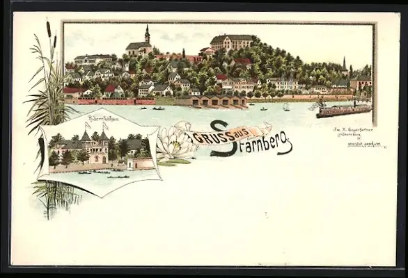 Lithographie Starnberg, Uferpartie mit Kirche, Ruderclubhaus