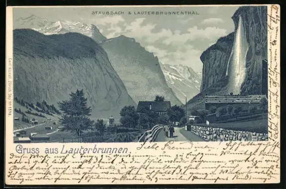 Lithographie Staubbach, Spaziergänger am Wasserfall