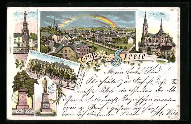 Lithographie Steele, Mariensäule, Kath. Kirche, Amtsgericht, Postamt und Kaiser Friedrich-Denkmal
