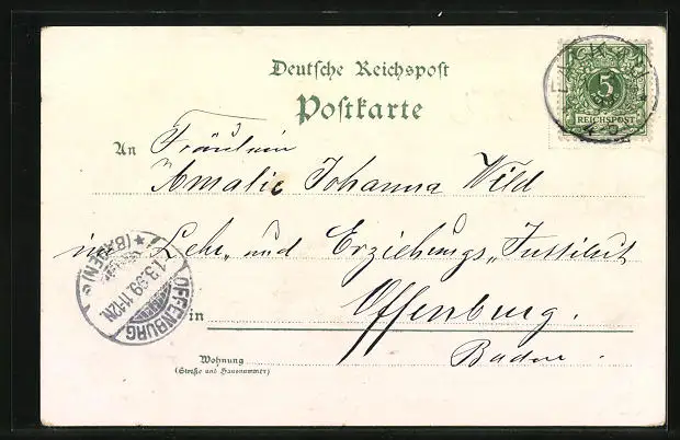 Personenbezogene Daten auf der Rückseite der Karte wurden durch blauen Textmarker unkenntlich gemacht. Die blauen Stellen sind auf die Vorderseite durchgeweicht und wirken sich negativ auf das Postkartenfoto aus