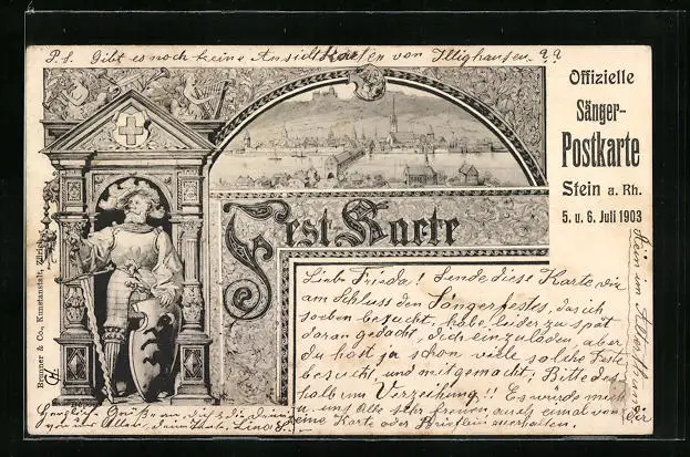 Lithographie Stein a. Rh., Sängerfest 1903, Teilansicht mit Kirche, Wächter mit Schwert und Schild