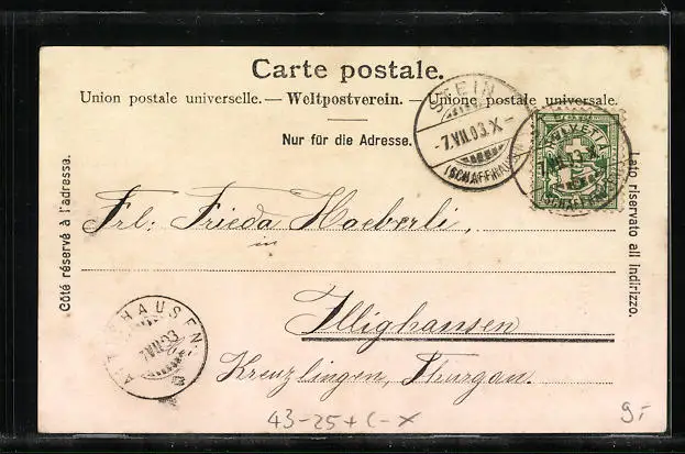 Personenbezogene Daten auf der Rückseite der Karte wurden durch blauen Textmarker unkenntlich gemacht. Die blauen Stellen sind auf die Vorderseite durchgeweicht und wirken sich negativ auf das Postkartenfoto aus