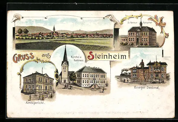Lithographie Steinheim, St. Rochus-Hospital, Amtsgericht, Krieger-Denkmal
