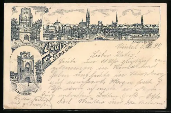 Lithographie Stendal, Uenglinger-Tor, Tangermünder-Tor, Gesamtansicht