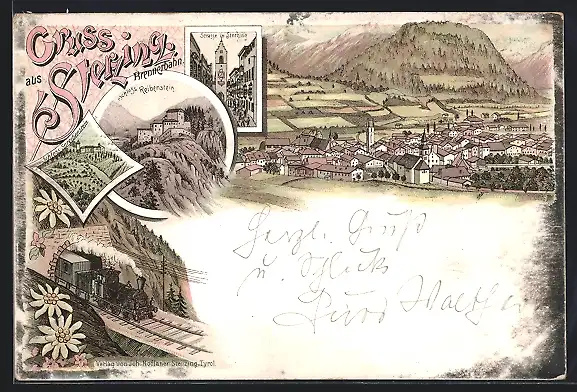Lithographie Sterzing, Schloss Reibenstein, Eisenbahn im Tunnel, Strasse im Sterzing