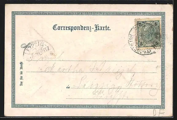 Personenbezogene Daten auf der Rückseite der Karte wurden durch blauen Textmarker unkenntlich gemacht. Die blauen Stellen sind auf die Vorderseite durchgeweicht und wirken sich negativ auf das Postkartenfoto aus