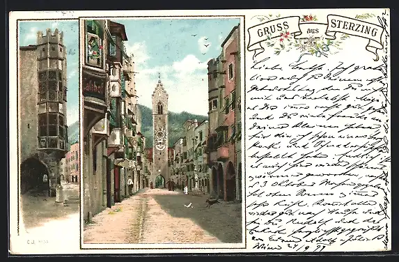 Lithographie Sterzing, Strassenpartie mit Torbogen