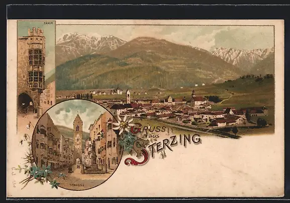 Lithographie Sterzing, Totalansicht mit Strasse und Erker