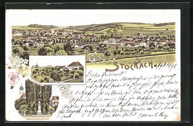 Lithographie Stockach, Kriegerdenkmal, Totalansicht, Nellenburg