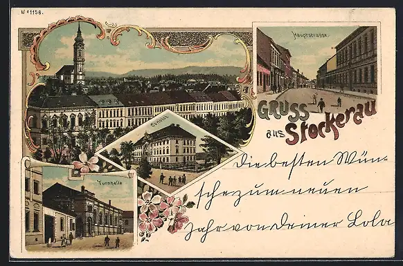 Lithographie Stockerau, Hauptstrasse, Convict, Turnhalle