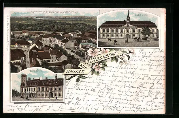 Lithographie Stockerau, Schlössl, Rathaus, Südwestliche Ortsansicht
