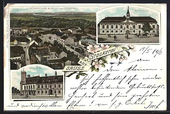 Lithographie Stockerau, Südwestl. Ansicht, Schlössl und Rathhaus