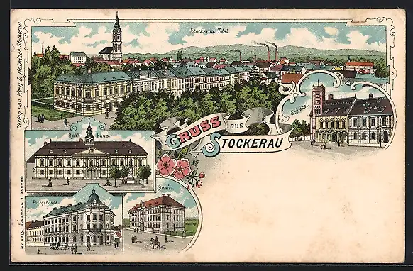Lithographie Stockerau, Totalansicht, Rathaus, Post
