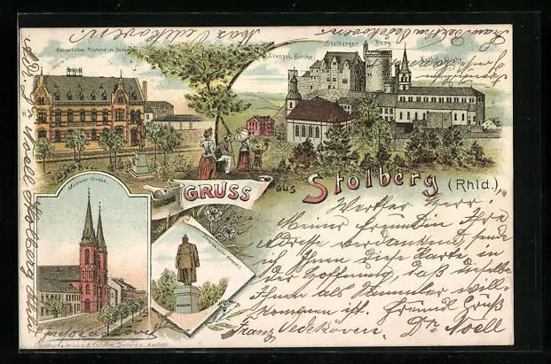Lithographie Stolberg /Rhld., Ortspartie mit Post, Kirche und Burg, Mühlener Kirche
