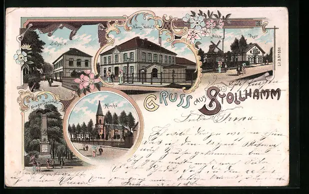 Lithographie Stollhamm, Harms Hotel, Schule, Kirche