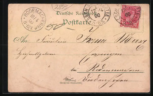 Personenbezogene Daten auf der Rückseite der Karte wurden durch blauen Textmarker unkenntlich gemacht. Die blauen Stellen sind auf die Vorderseite durchgeweicht und wirken sich negativ auf das Postkartenfoto aus
