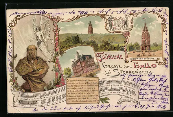 Lithographie Stoppenberg, Kaiser-Wilhelm-Turm mit Büste und Engel