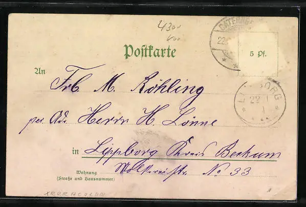 Personenbezogene Daten auf der Rückseite der Karte wurden durch blauen Textmarker unkenntlich gemacht. Die blauen Stellen sind auf die Vorderseite durchgeweicht und wirken sich negativ auf das Postkartenfoto aus