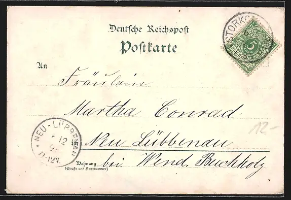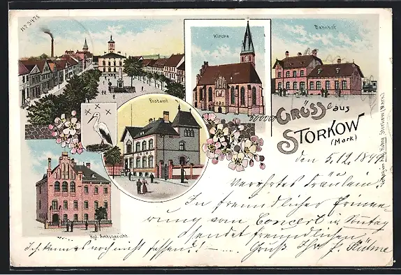 Lithographie Storkow /Mark, Bahnhof, Kirche, Postamt