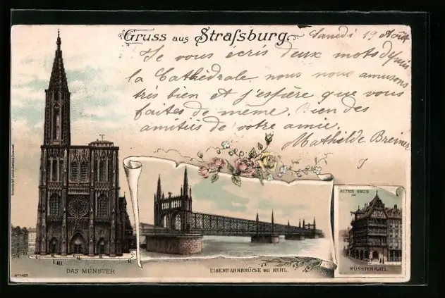 Lithographie Strassburg, Das Münster und Eisenbahnbrücke
