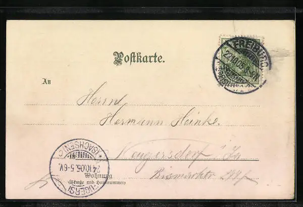 Personenbezogene Daten auf der Rückseite der Karte wurden durch blauen Textmarker unkenntlich gemacht. Die blauen Stellen sind auf die Vorderseite durchgeweicht und wirken sich negativ auf das Postkartenfoto aus