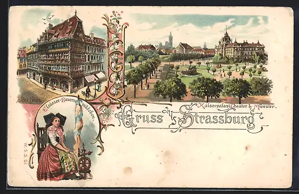 Lithographie Strassburg, Kaiserpalast, Theater, Münster