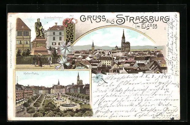 Lithographie Strassburg, Kleber-Platz, Gutenberg-Denkmal, Ortsansicht