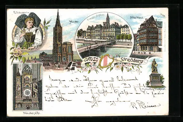 Lithographie Strassburg, Münster, Altes Haus, Elsässserin, Wappen