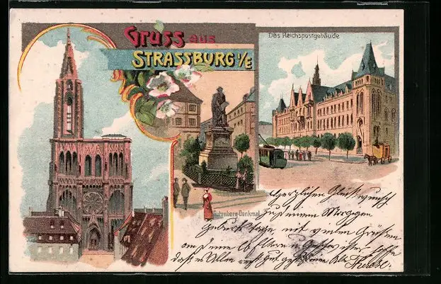 Lithographie Strassburg, Reichspostgebäude, Gutenberg-Denkmal