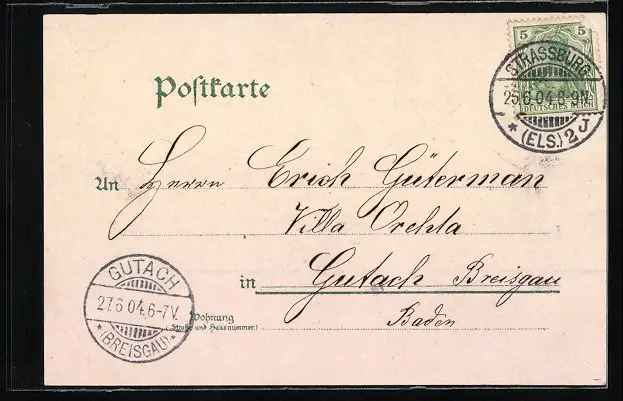 Personenbezogene Daten auf der Rückseite der Karte wurden durch blauen Textmarker unkenntlich gemacht. Die blauen Stellen sind auf die Vorderseite durchgeweicht und wirken sich negativ auf das Postkartenfoto aus