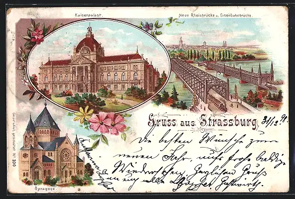 Lithographie Strassburg, Synagoge, Kaiserpalast, Neue Rheinbrücke