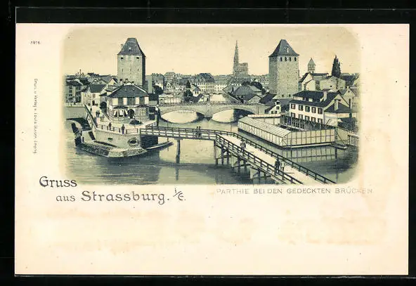 Lithographie Strassburg i. E., Partie bei den gedeckten Brücken