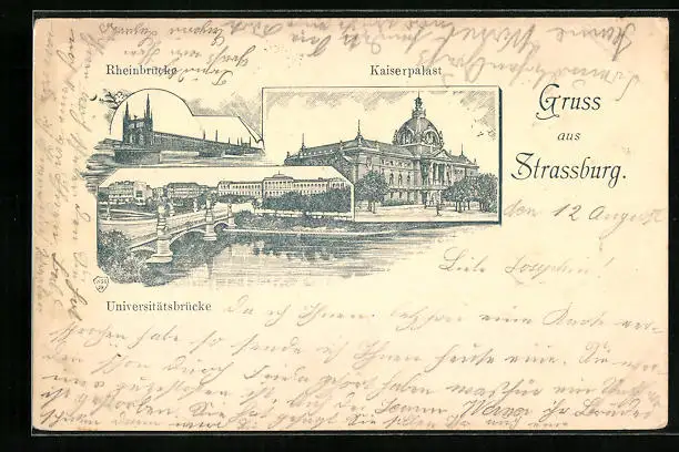 Lithographie Strassburg i. E., Rheinbrücke, Universitätsbrücke und Kaiserpalast