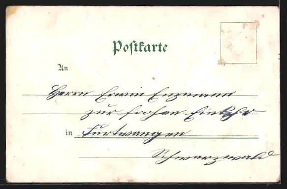 Personenbezogene Daten auf der Rückseite der Karte wurden durch blauen Textmarker unkenntlich gemacht. Die blauen Stellen sind auf die Vorderseite durchgeweicht und wirken sich negativ auf das Postkartenfoto aus
