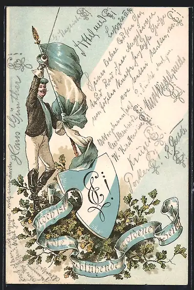 Lithographie Student erhebt den Dolch hinter dem Studentenwappen